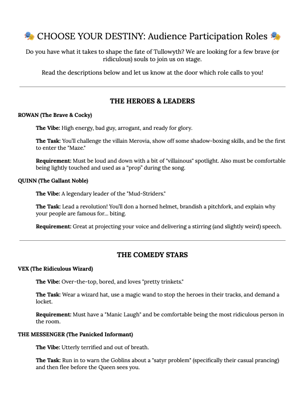 Be a part of the show! See below for roles willing audience members can play!